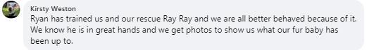 Ryan is a great trainer, a natural with dogs and very personable with us humans! Thank you Ryan!